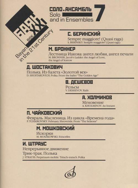 Серия сборников "Баян в ХХI веке: соло, ансамбль" издается по инициативе народного артиста России Ф.Липса. Выпуск 7 содержит оригинальное произведение для баяна (А.Холминов), и сочинения, в которых баян представлен в ансамбле с другими инструментами (М.Броннер, С.Беринский), а также переложения для баяна отечественной и зарубежной классики (Д.Шостакович, В.Дешевов, П.Чайковский, М.Мошковский, И.Штраус).