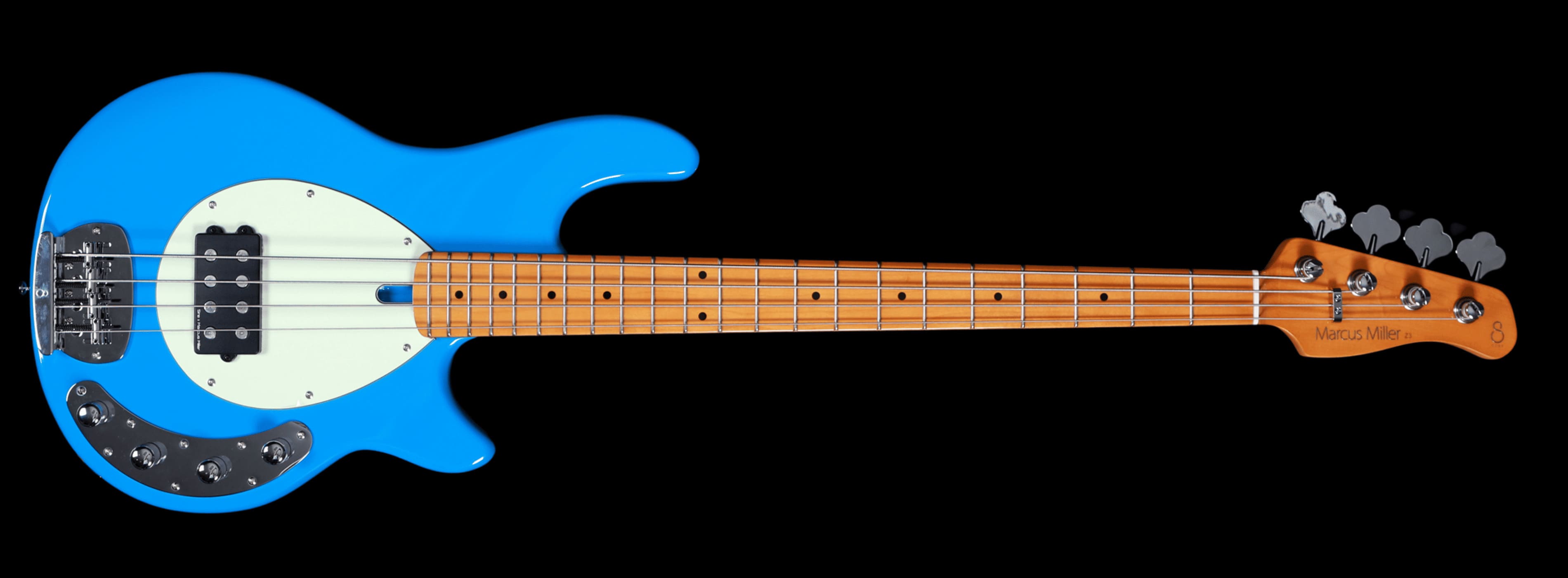 Пятиструнный бас Marcus Miller Z3-5 Blue в голубой отделке вдохновлён формой модели 1970-х годов и имеет нестандартный корпус из красного дерева с округлыми контурами, двумя вырезами и пикгардом мятно-зелёного оттенка, повторяющим форму яйца. Кленовый гриф на болтах имеет классический C-образный профиль. Накладка из клёна оснащена 34-дюймовой мензурой, 12-дюймовым радиусом для облегчения изгибов струн и 22 ладами среднего размера.