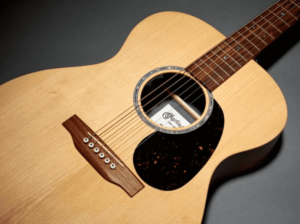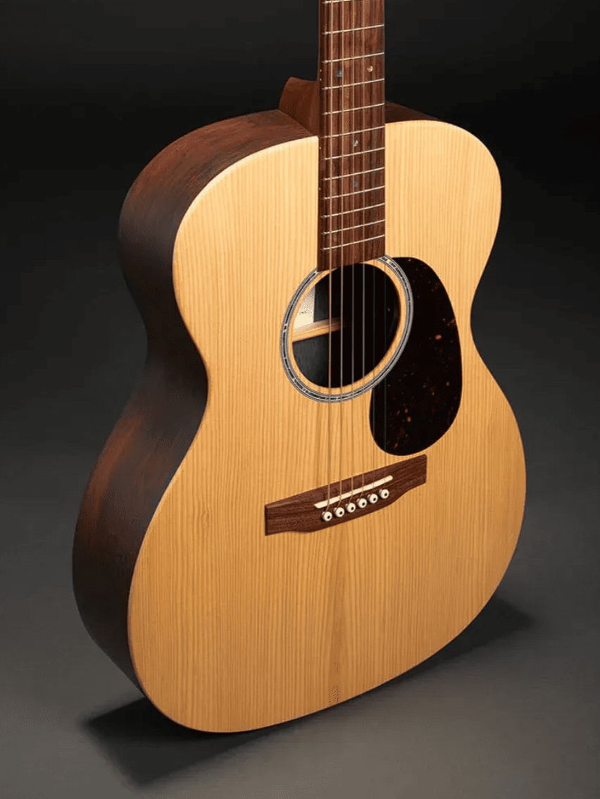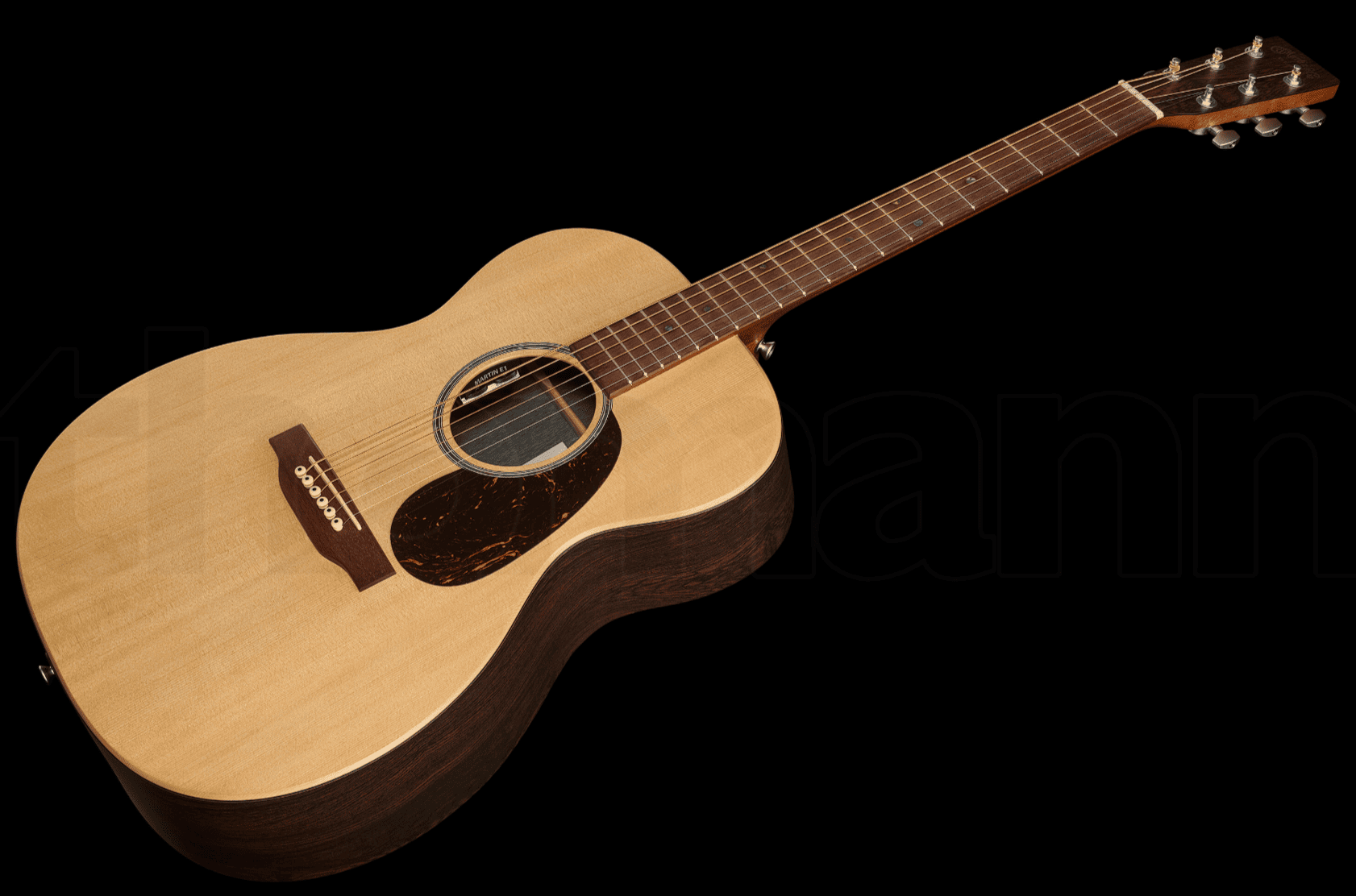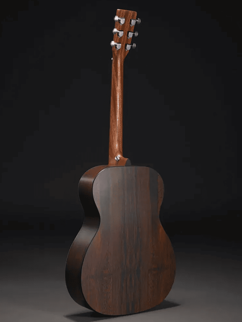 Гитара Martin Guitars 0X2E имеет небольшой корпус Concert в сатиновой натуральной отделке. Верхняя дека изготовлена из ели, отполированной вручную, а спинка и обечайка — из пластика высокого давления с древесным рисунком кокоболо. Гриф из древесины твёрдых пород крепится к кузову врезным и шипованным соединением на уровне четырнадцатого лада. Более тонкая накладка с мягко скошенной кромкой оснащена мензурой 24,9 дюймов, верхним порожком шириной 44,45 мм и 20 ладами со вставками Style 28 в виде точек из абалона.
