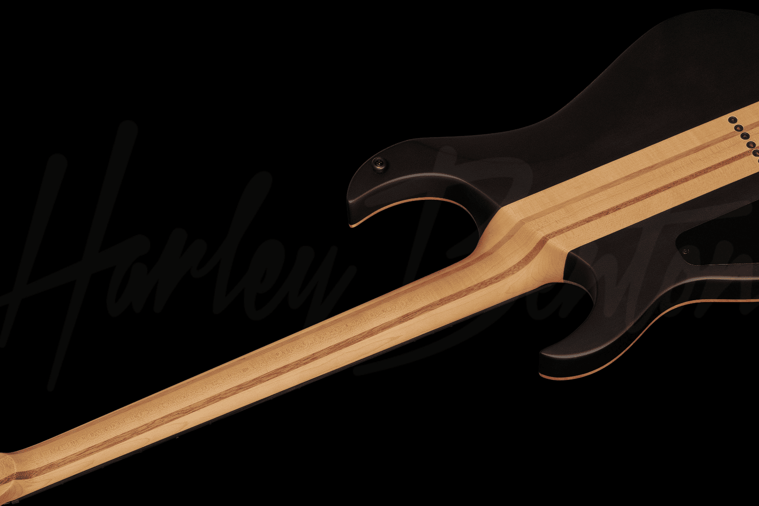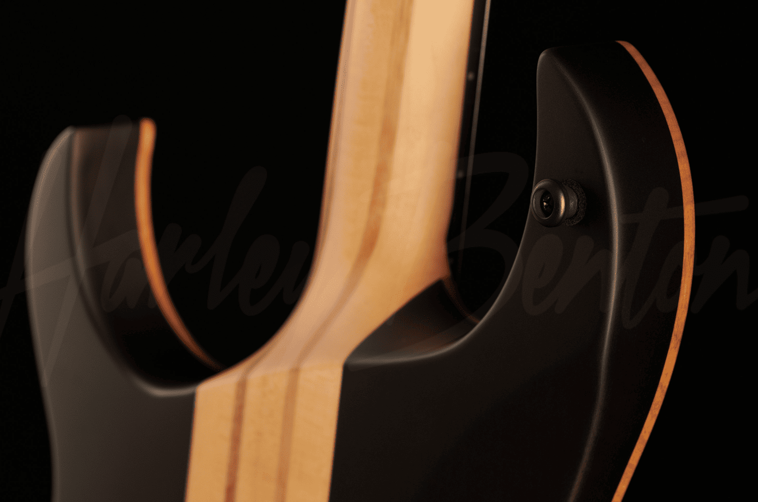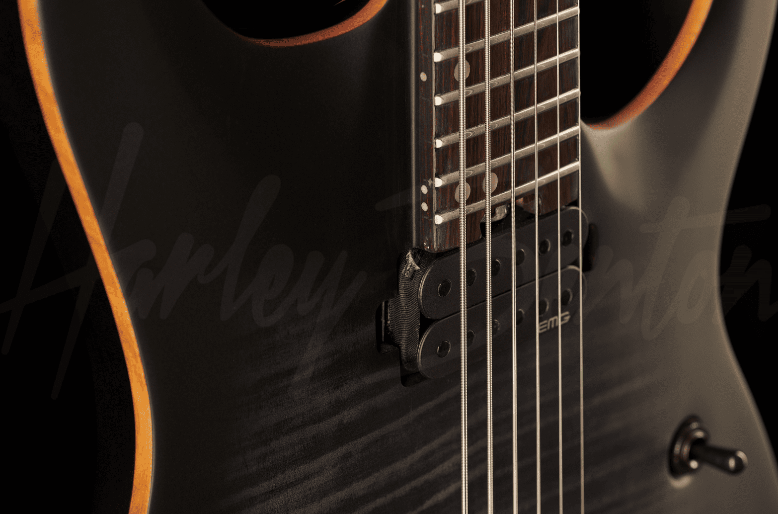 Дизайн гитары Harley Benton Amarok-BT BKNT в чёрной отделке Black Natural Flame Burst Satin расширяет концепцию Amarok за счёт длинной 27-дюймовой мензуры, разработанной для придания риффам еще большей силы. Плавные контуры корпуса из красного дерева с окантовкой из натуральной древесины делают модель более комфортной, а удлинённый 5-слойный гриф добавляет производительности и эффектности игре. Накладка на гриф изготовлена из чёрного дерева и имеет удобный профиль Slim Modern C, 24 огромных лада из нержавеющей стали, инкрустацию в виде перламутровых точек и светящиеся в темноте боковые маркеры.