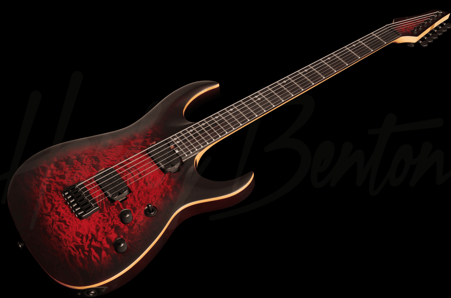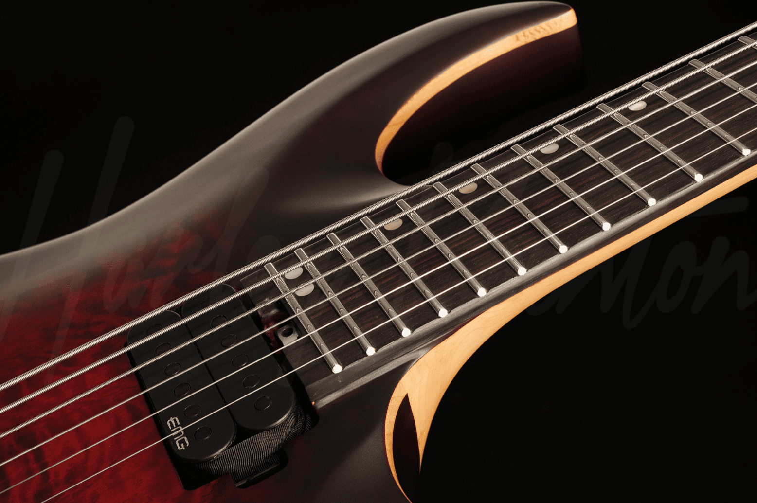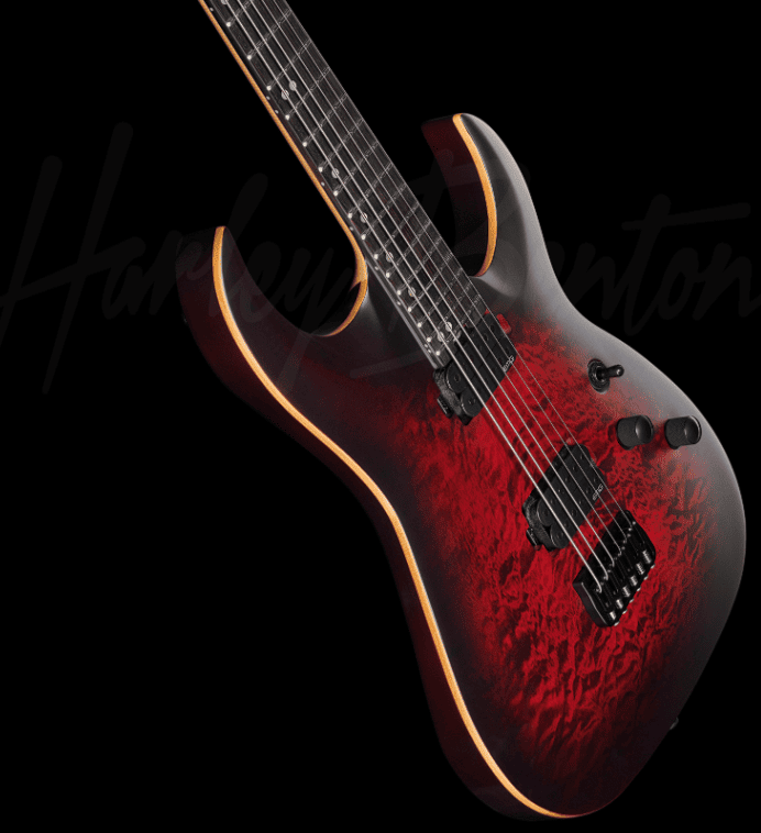 Гитара Harley Benton Amarok-BT в отделке Black Red Quilted Burst имеет деку из красного дерева и винир топом из клена. Сквозной гриф из 5и кусков клена и красного дерева с профилем Slim Modern C. Накладка из черного дерева радиусом 14 дюймов оснащена баритон мензурой 27 дюймов, 24 стальных Jumbo лада от компании Blacksmith и инкрустацией в виде белых точек, смещенных к краю накладки.
