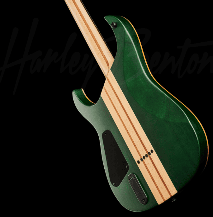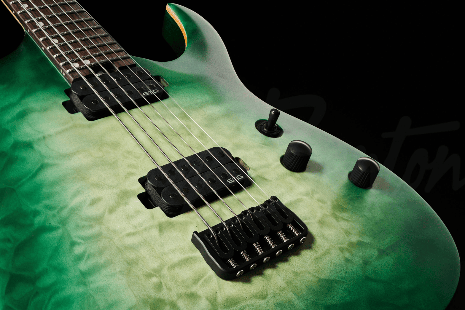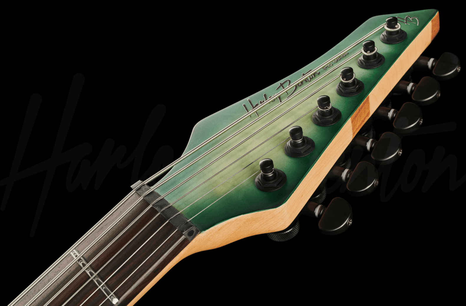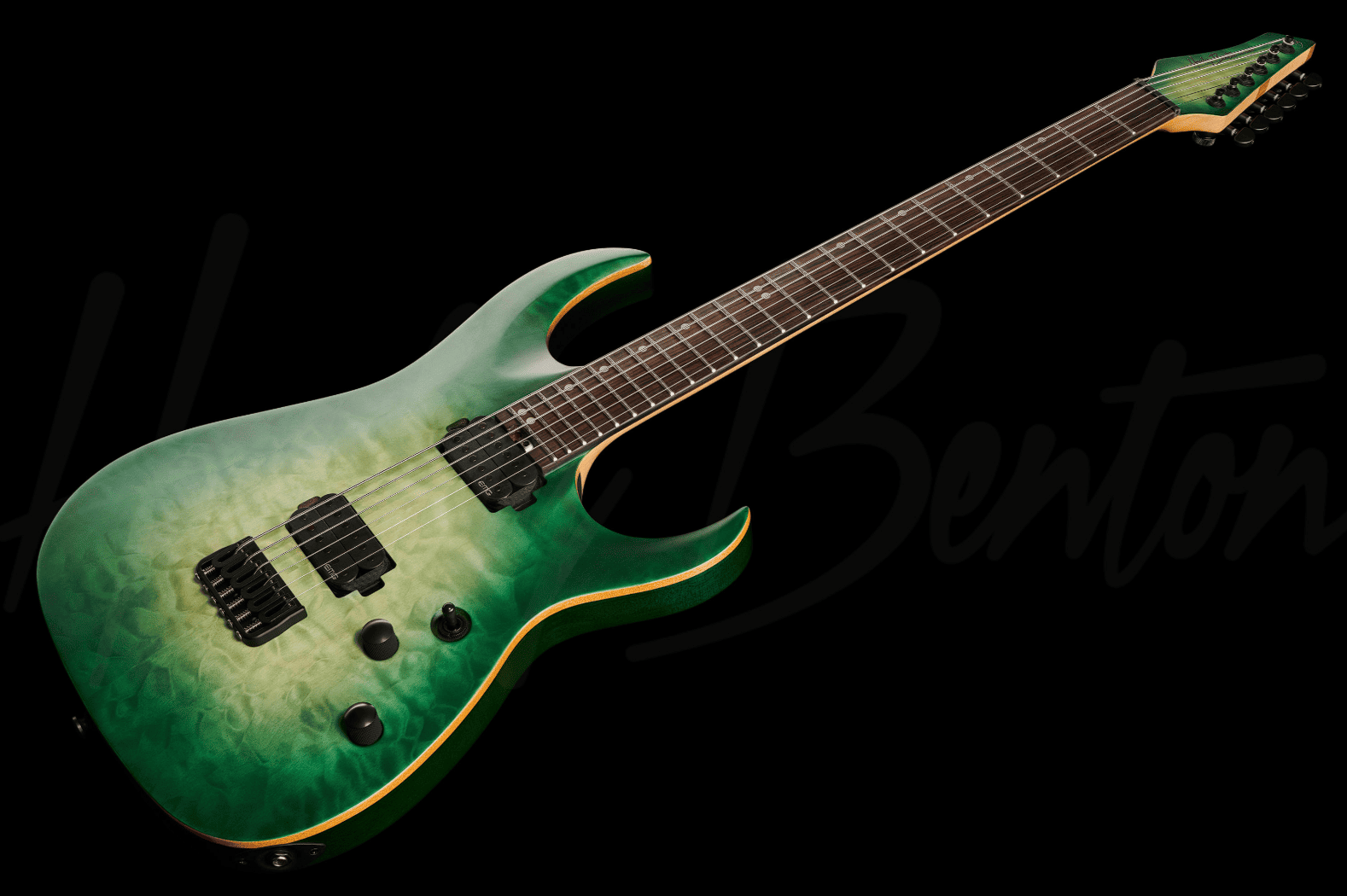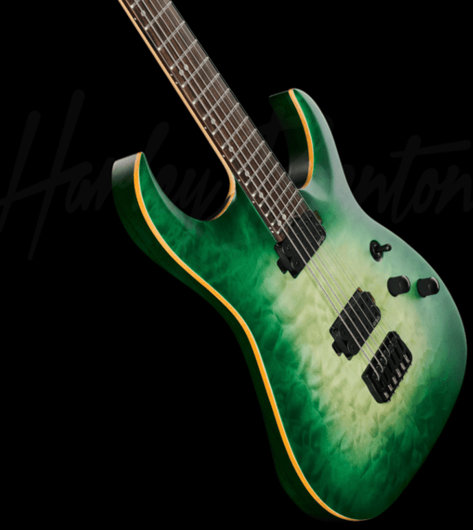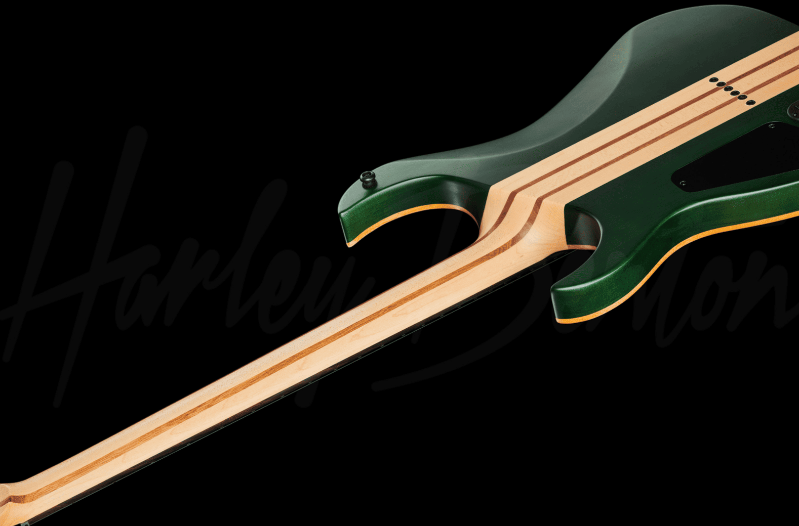 Гитара Harley Benton Amarok-BT в отделке Emerald Natural Quilted Burst Satin имеет деку из красного дерева и винир топом из клена. Сквозной гриф из 5и кусков клена и красного дерева с профилем Slim Modern C. Накладка из черного дерева радиусом 14 дюймов оснащена баритон мензурой 27 дюймов, 24 стальных Jumbo лада от компании Blacksmith и инкрустацией в виде белых точек, смещенных к краю накладки.