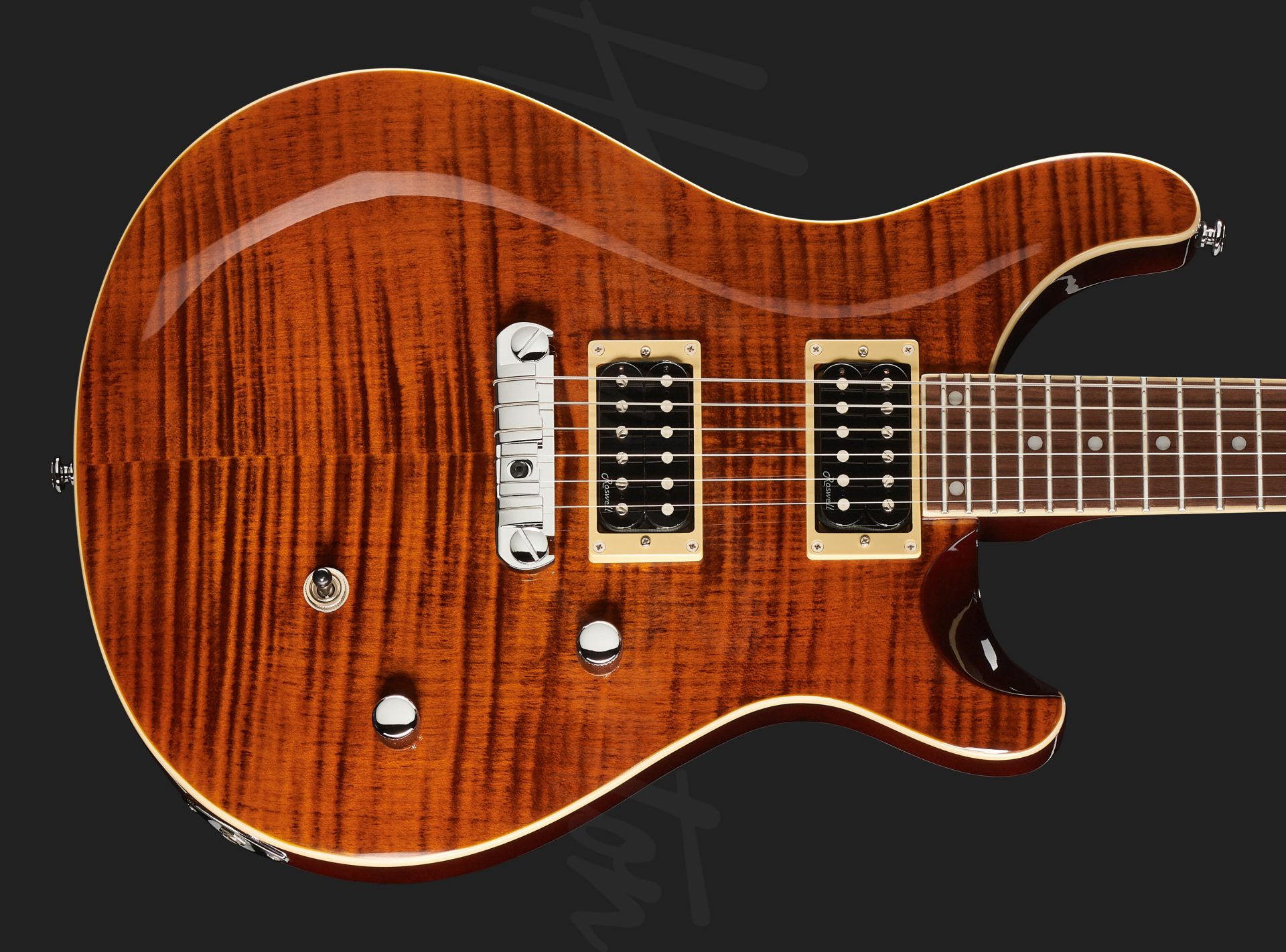 Harley Benton CST-24T в глянцевой отделке Amber Stripes с деревянной окантовкой обладает изящным корпусом из меранти с двумя вырезами и изогнутой верхней декой из пламенного клёна. Простой в игре гриф из меранти имеет округлый профиль в форме буквы «С» и крепится к кузову клеем. Накладка из жареной древесины ятоба с радиусом 13,78 дюймов оснащена короткой 25-дюймовой мензурой и 24 ладами из нержавеющей стали с перламутровой инкрустацией в виде точек.