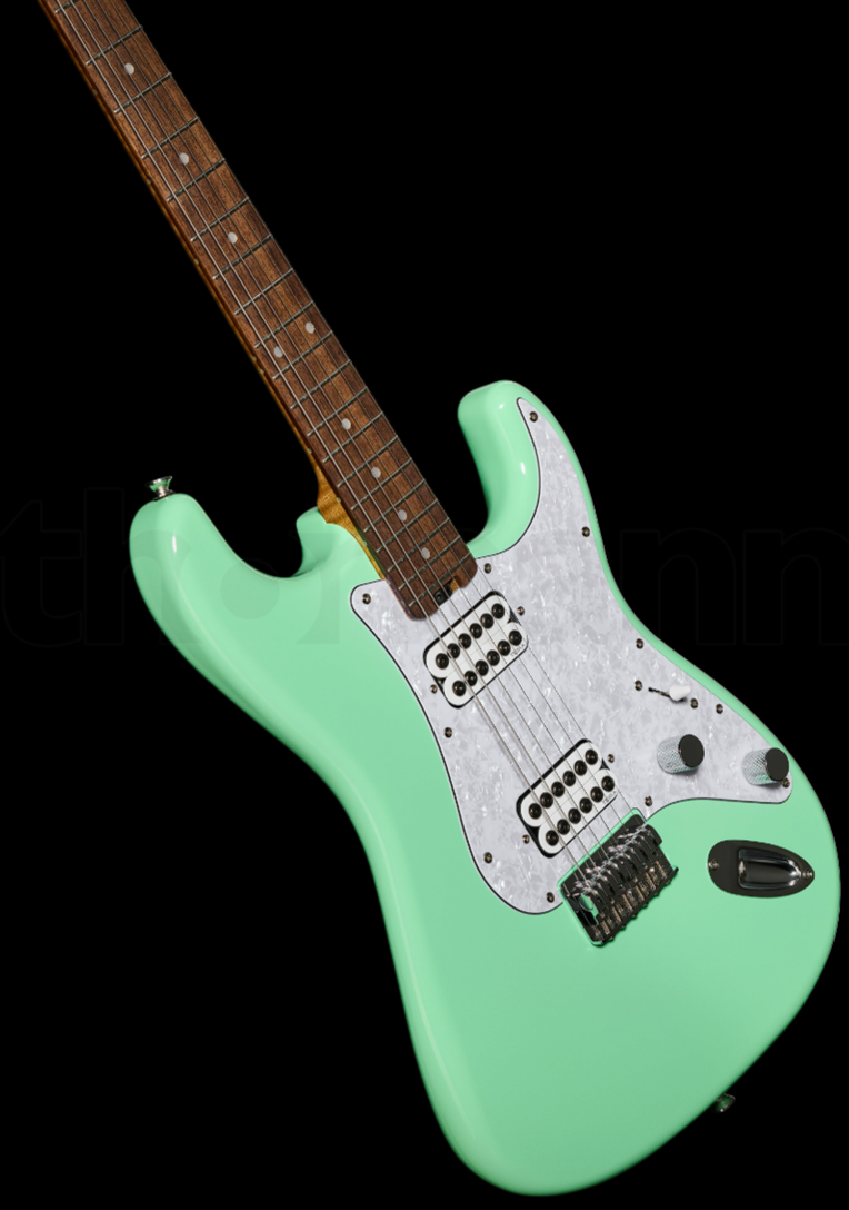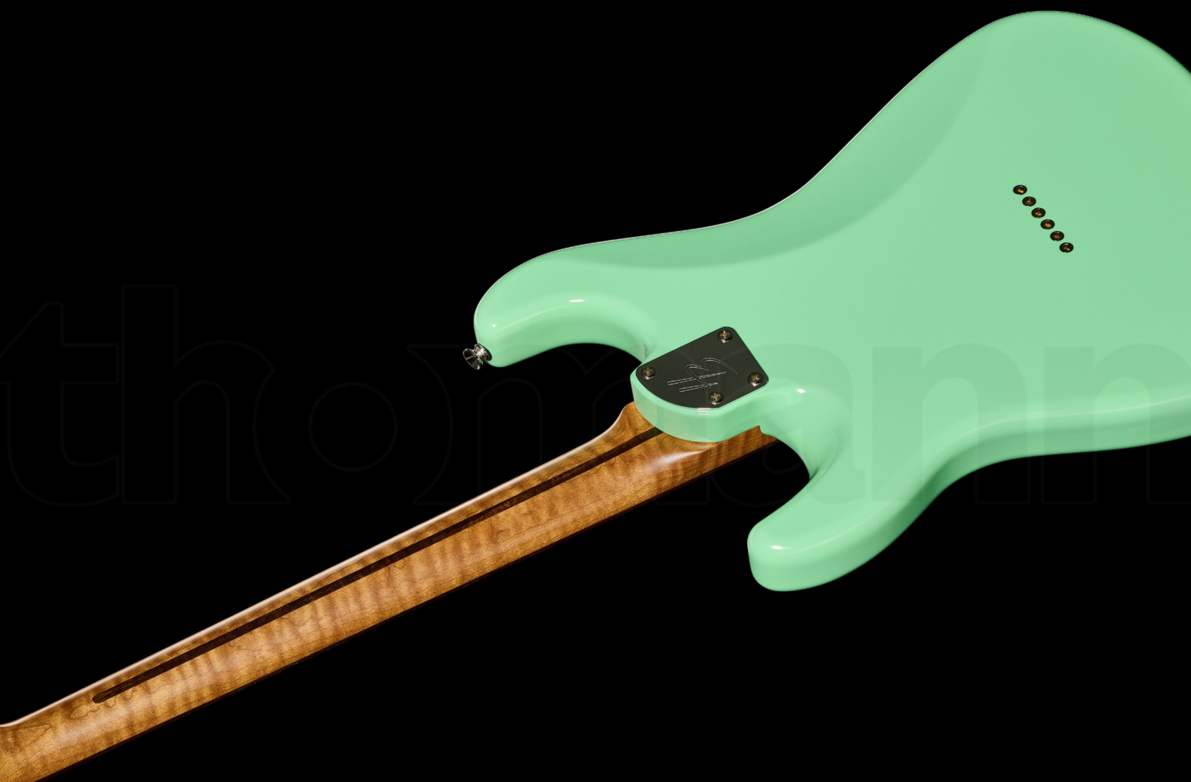 Гитара Harley Benton ST Modern Plus обладает эргономичный корпусом из американской липы, выполненным в стиле Stratocaster. Гриф на болтах изготовлен из печёного и огненного канадского клёна, сочетание которых создают интересный древесный рисунок. Скульптурная пятка облегчает доступ к верхнему регистру. Лавровая накладка оснащена квадратными закруглёнными краями для удобной игры, универсальной мензурой 25,5 дюйма и 22 средними ладами из нержавеющей стали. Сложный радиус 12-16 дюймов позволяет легко перемещаться по накладке грифа. Подбор материалов делает звук инструмента богатым и резонансным с резкой атакой.