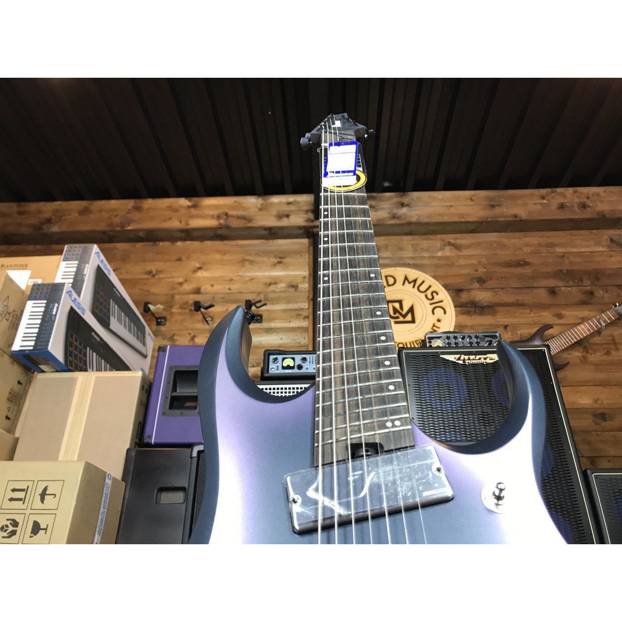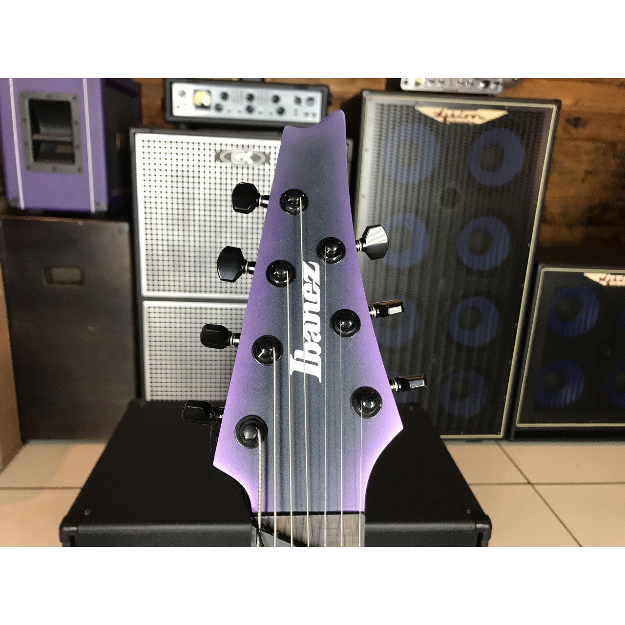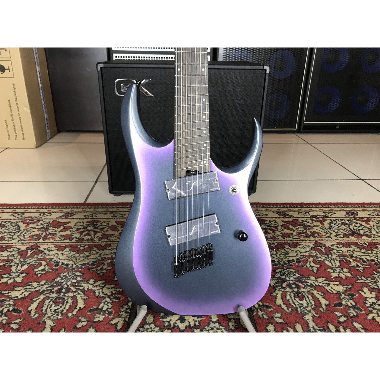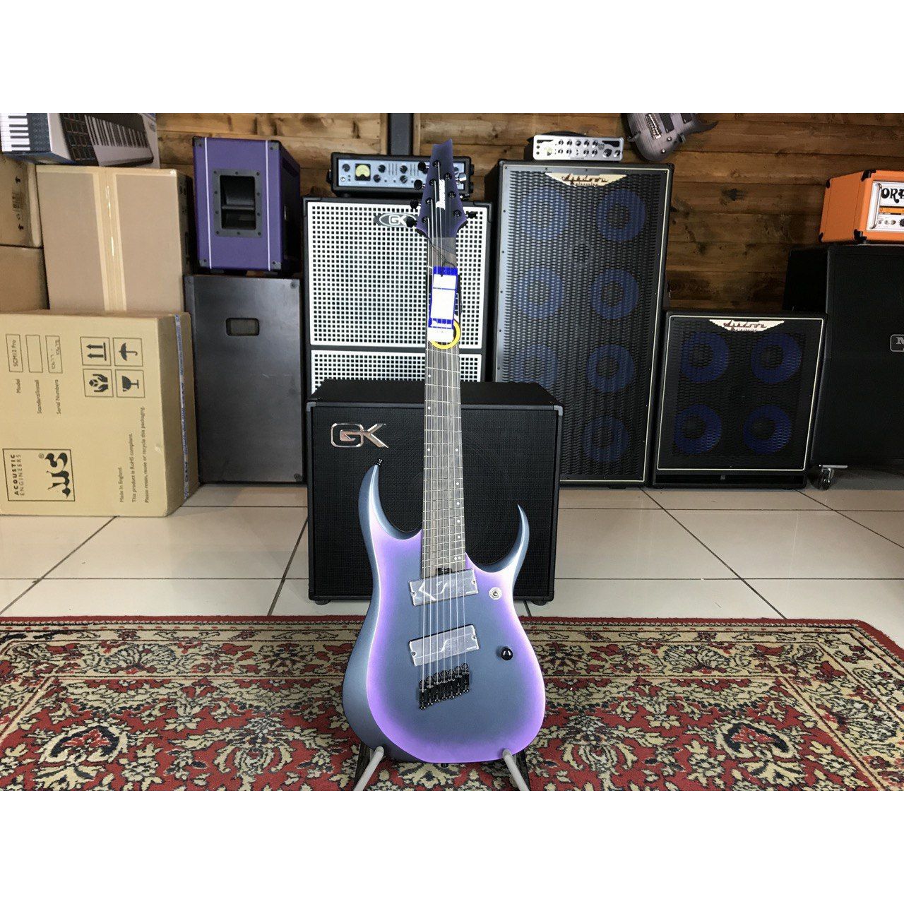 Семиструнная гитара Ibanez Axion Label RGD71ALMS-BAM имеет сложную матовую отделку Black Aurora Burst Matte, которая напоминает покрытие «хамелеон». Эргономичный корпус из ньято изготовлен в стиле Superstrat и отличается глубокими вырезами, заострёнными «рогами» и изгибом под правую руку. Гриф обладает профилем Nitro Wizard-7, разработанным для мультимензур, и состоит из пяти частей древесины панга-панга и грецкого ореха. Накладка из чёрного дерева Macassar радиусом 15,75 дюймов оснащена 24 ладами, мензурой 25,5-27 дюймов и белыми вставками в виде смещённых к краю точек.