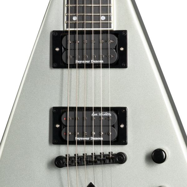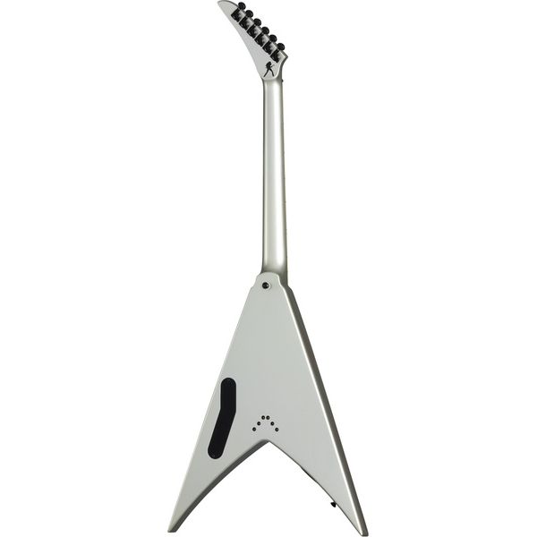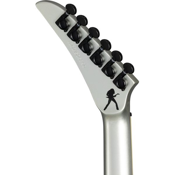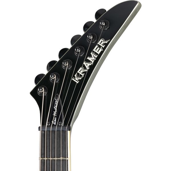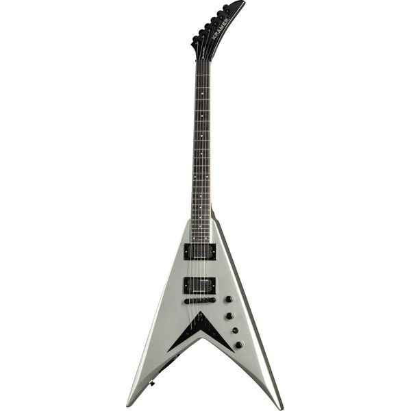 Гитара Kramer Guitars Dave Mustaine Vanguard в отделке Silver Metallic имеет деку из красного дерева. Вклеенный гриф из красного дерева профилем Medium C. Накладка из черного дерева радиусом 12 дюймов оснащена универсальной мензурой 25.5 дюйма, 24 Jumbo ладами и инкрустацией в виде белых точек.