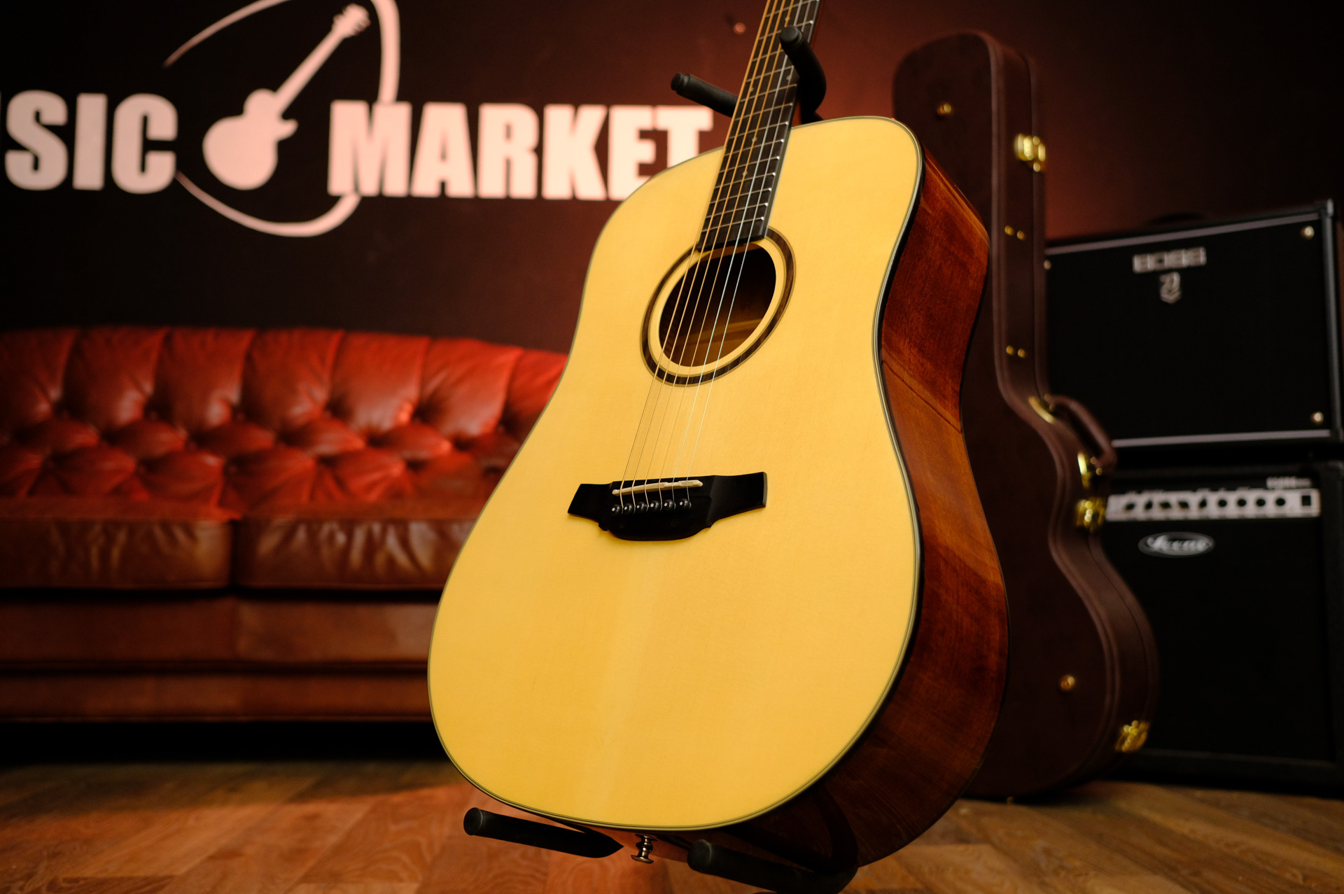 Полноразмерная акустическая гитара в корпусе дредноут. Верхняя дека гитары выполнена из массива ели Энгельмана, которая в производстве музыкальных инструментов ценится выше, чем обычная ель.