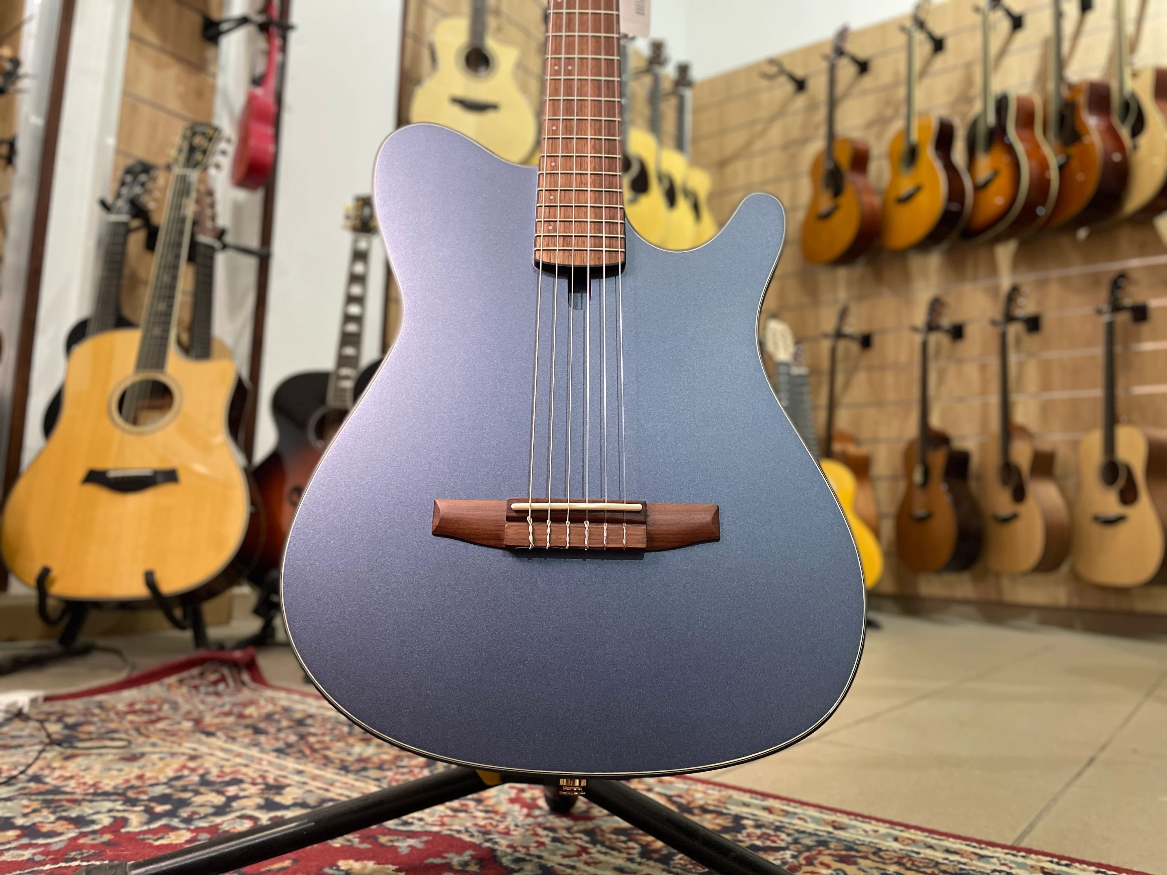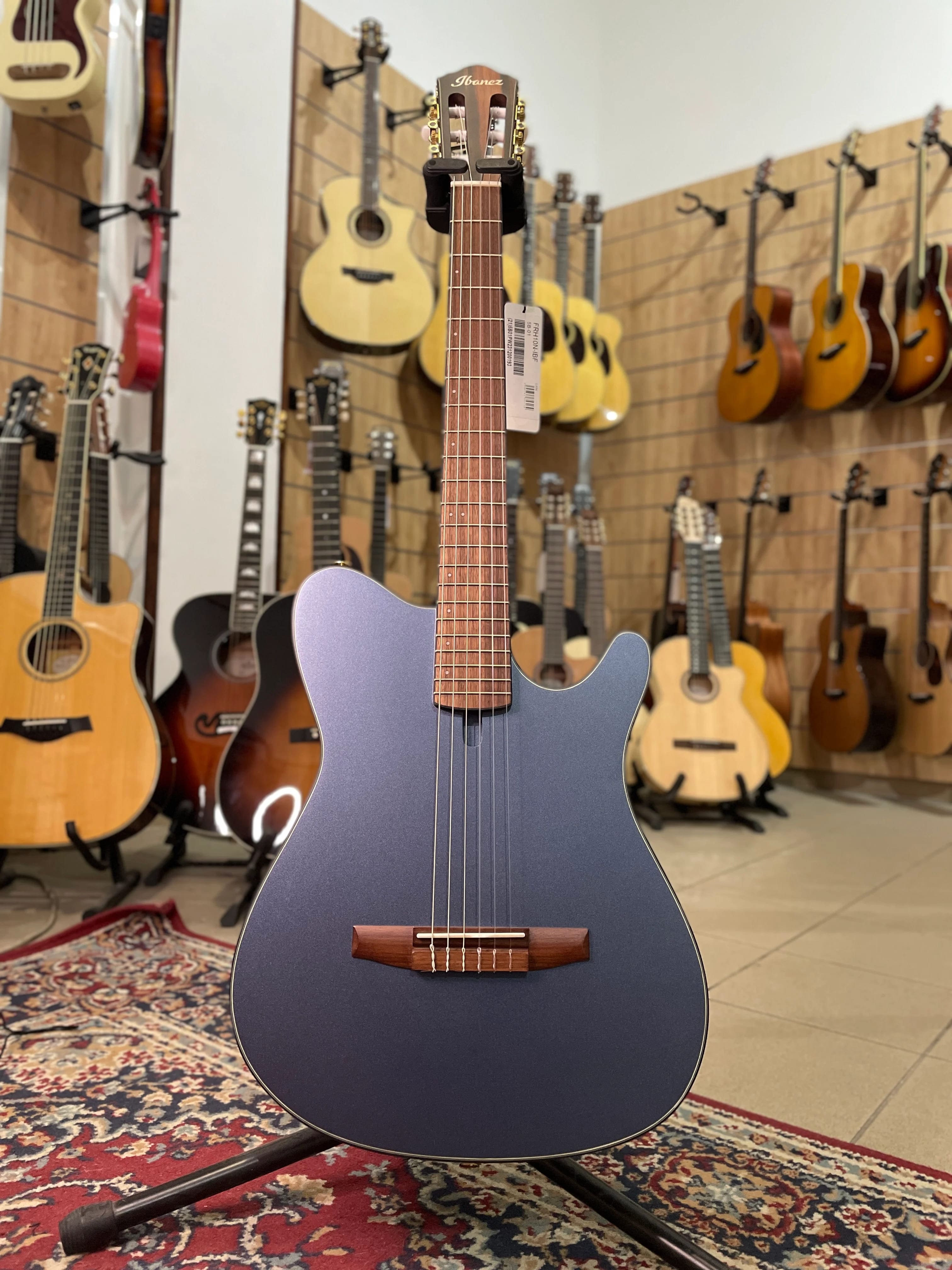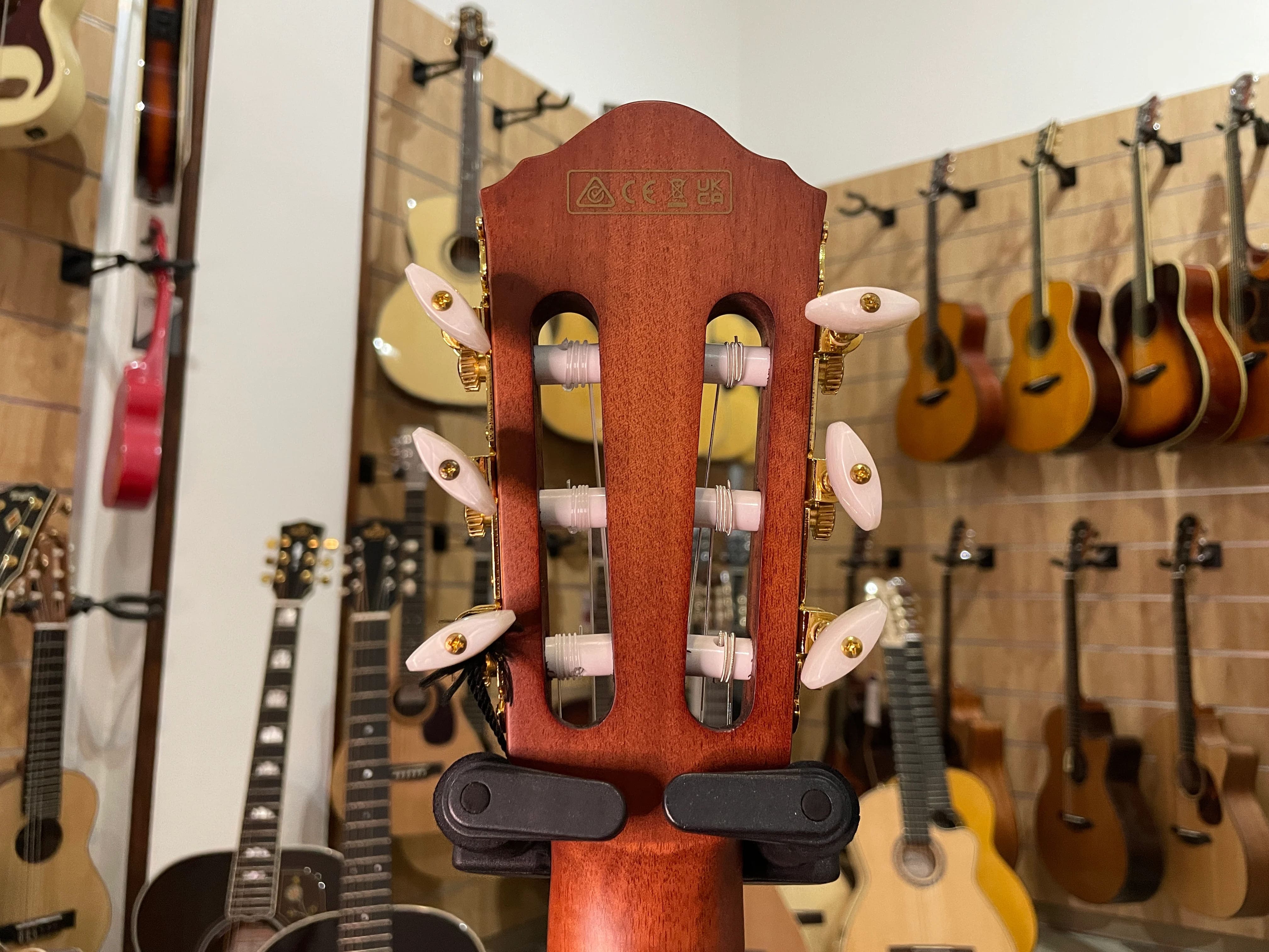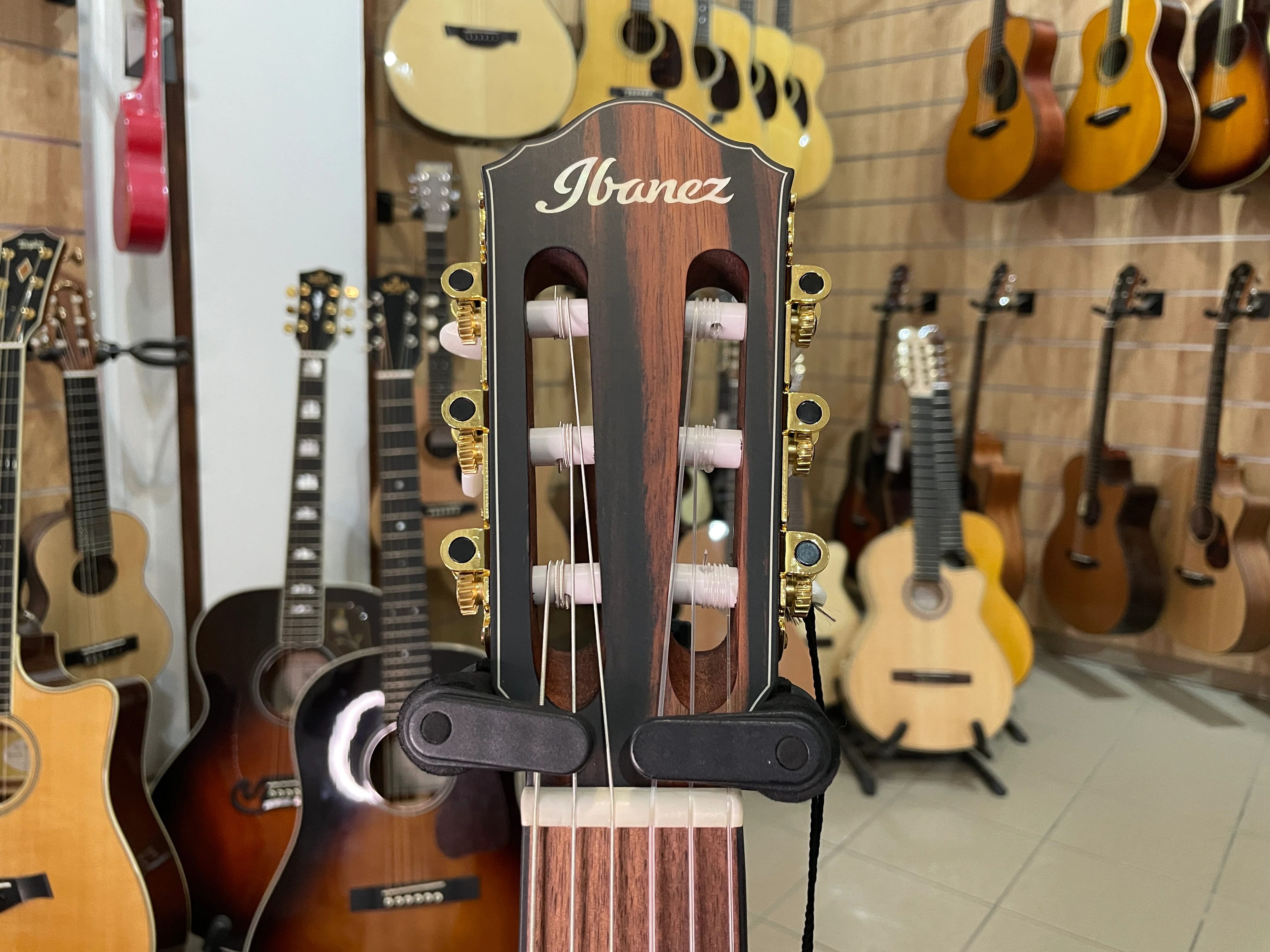 Изготовленная на заказ электроника со звукоснимателем Ibanez T-bar под седлом обеспечивают удобное управление и усиление естественного звучания инструмента. Модель дополнена бриджем из грецкого ореха, звуковым отверстием на обечайке и золотистыми колками в классическом стиле.