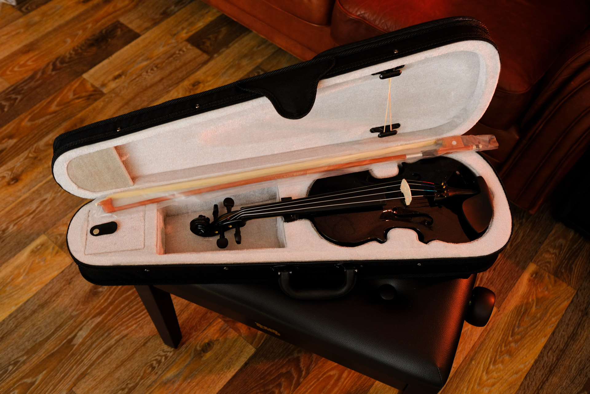 Смычок, который идет в комплекте поможет приучить пальцы к правильной постановке, хоть старым методом, хоть новым. А жесткий чехол убережет скрипку от негативного воздействия.
