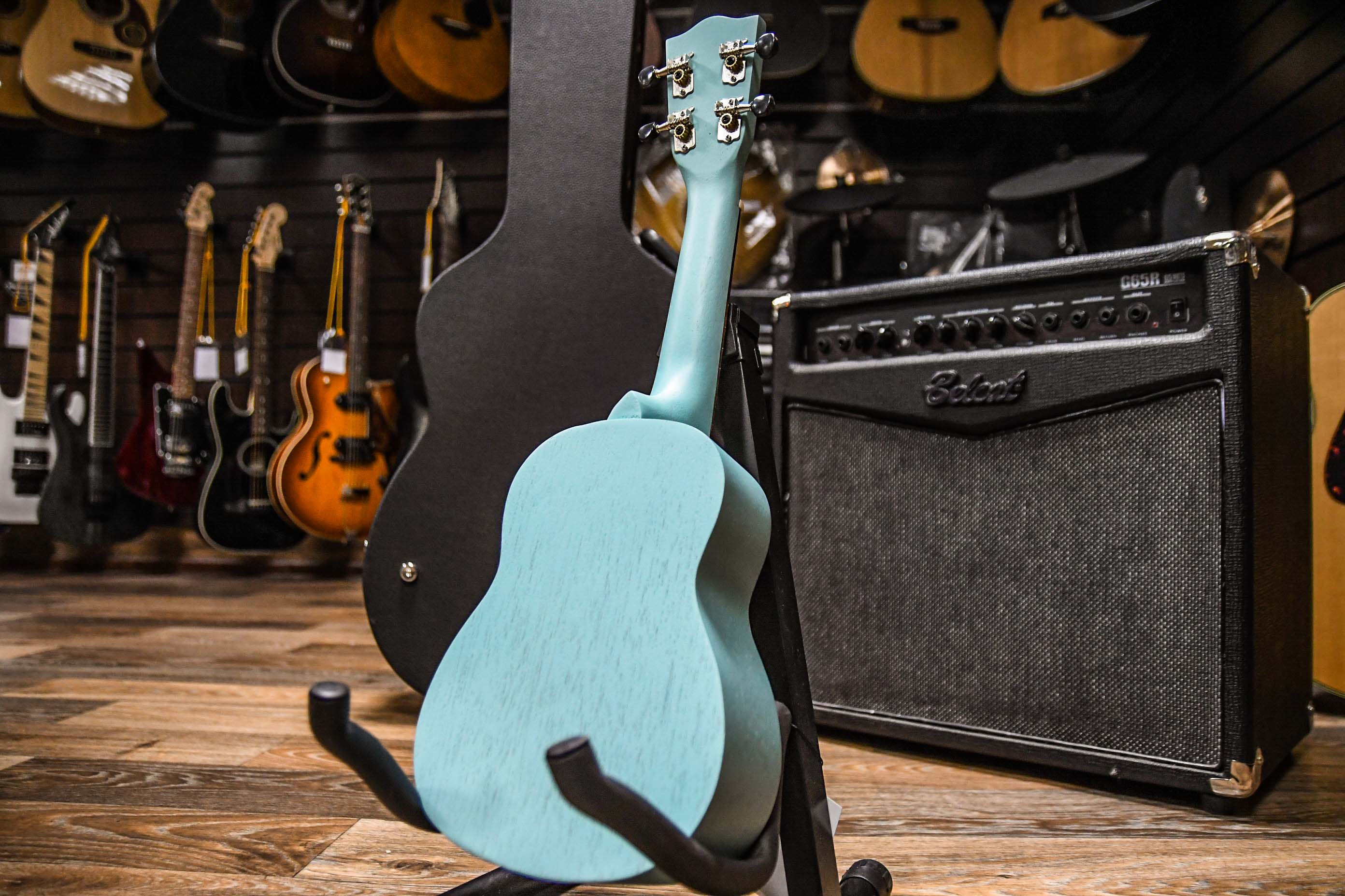 Гриф инструмента произведен из палисандра и дерева Нато (порода красного дерева), а корпус – из меранти, основной цвет которой и преобладает в палитре этой модели. Благодаря матовому(лаковому) натуральному(черному, синему и т.д) покрытию легко поддается уходу и дольше сохраняет опрятный внешний вид. Звучание – звонкое и задорное, гораздо более чистое, чем у многих других моделей укулеле в этой же ценовой категории.